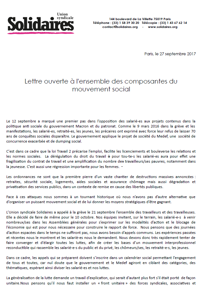 Aussi, l’Union syndicale Solidaires vous propose de nous rencontrer et de débattre de nos analyses de la situation et des nécessaires formes de mobilisation, de leur coordination pour les jours et semaines à venir, le 4 octobre à 18 h à la bourse du travail.
