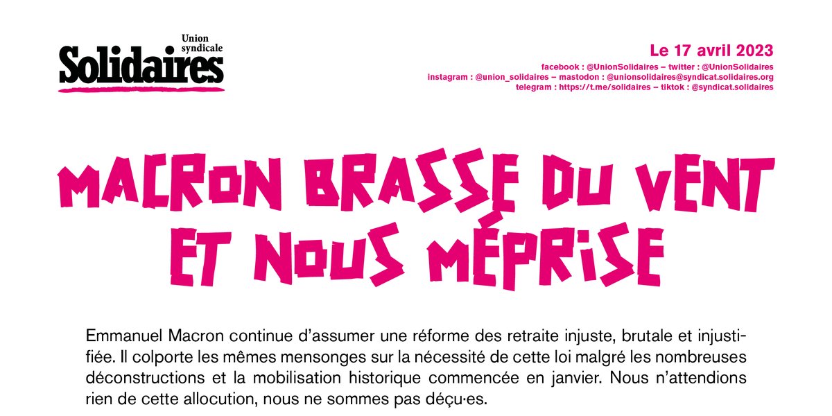 Emmanuel Macron continue d’assumer une réforme des retraite injuste, brutale et injustifiée. Il colporte les mêmes mensonges sur la nécessité de cette loi malgré les nombreuses déconstructions et la mobilisation historique commencée en janvier. Nous n’attendions rien de cette allocution, nous ne sommes pas déçu·es.