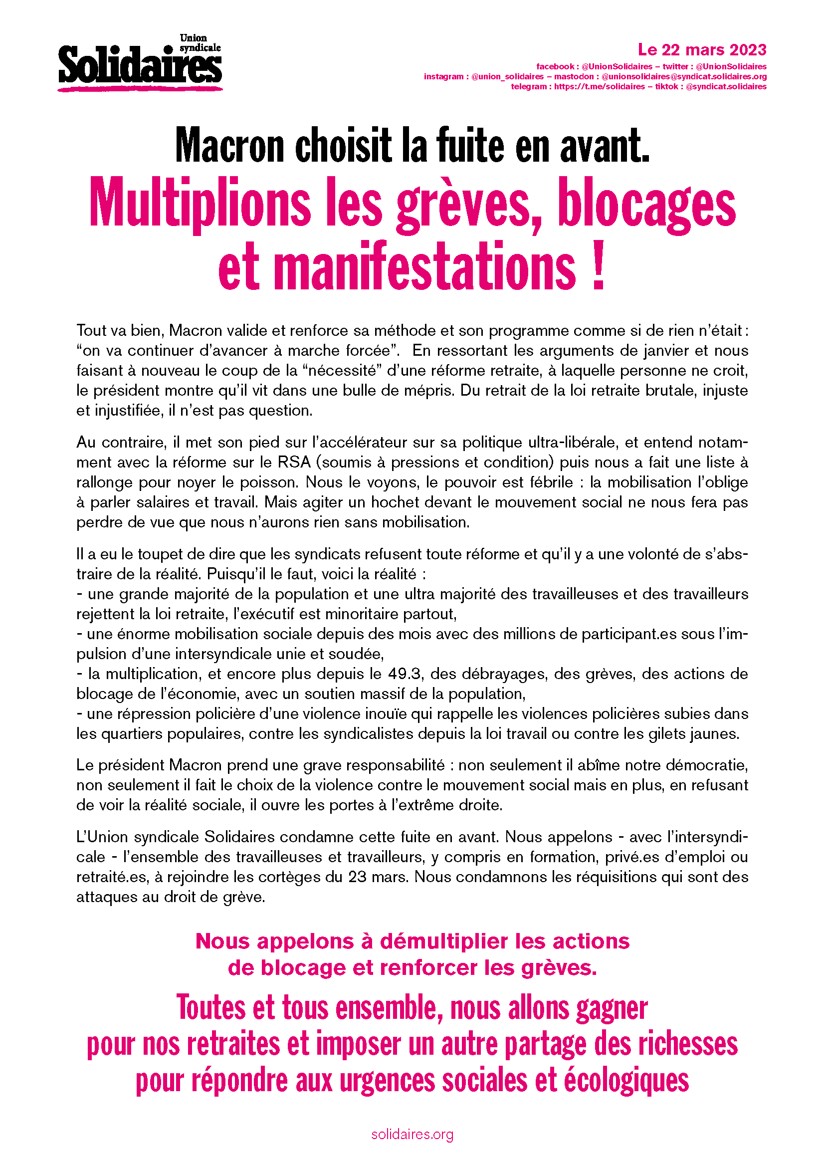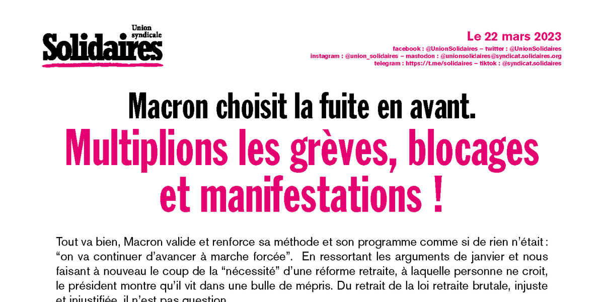 L’Union syndicale Solidaires condamne cette fuite en avant. Nous appelons - avec l’intersyndicale - l’ensemble des travailleuses et travailleurs, y compris en formation, privé.es d’emploi ou retraité.es, à rejoindre les cortèges du 23 mars. Nous condamnons les réquisitions qui sont des attaques au droit de grève.