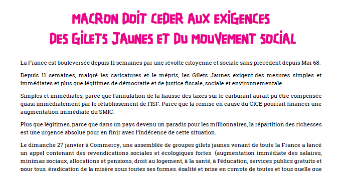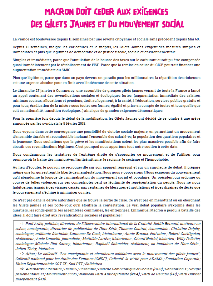 La France est bouleversée depuis 11 semaines par une révolte citoyenne et sociale sans précédent depuis Mai 68. Depuis 11 semaines, malgré les caricatures et le mépris, les Gilets Jaunes exigent des mesures simples et immédiates et plus que légitimes de démocratie et de justice fiscale, sociale et environnementale.