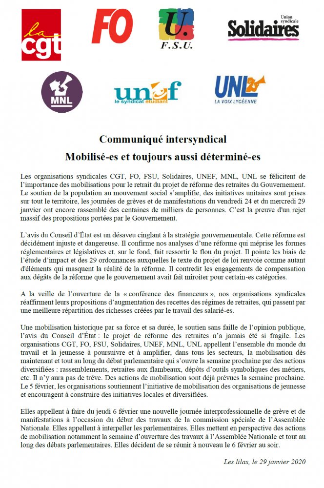 Les organisations syndicales CGT, FO, FSU, Solidaires, UNEF, MNL, UNL se félicitent de l’importance des mobilisations pour le retrait du projet de réforme des retraites du Gouvernement. Le soutien de la population au mouvement social s’amplifie, des initiatives unitaires sont prises sur tout le territoire, les journées de grèves et de manifestations du vendredi 24 et du mercredi 29 janvier ont encore rassemblé des centaines de milliers de personnes. C’est la preuve d'un rejet massif des propositions portées par le Gouvernement.