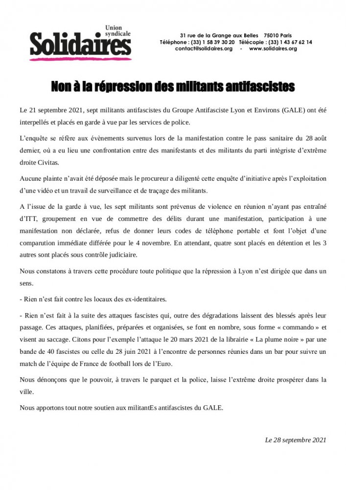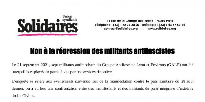 Le 21 septembre 2021, sept militants antifascistes du Groupe Antifasciste Lyon et Environs (GALE) ont été interpellés et placés en garde à vue par les services de police.