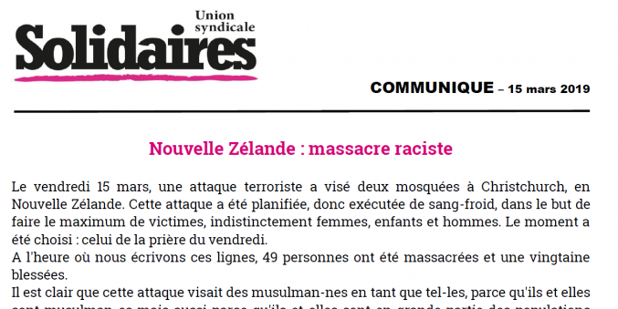 Ce jour, Solidaires est aux côtés des proches des assassiné-es, musulmanes et musulmans qui sont visé-es dans leur existence même par ces attaques. Uni-es nous réaffirmons que nous lutterons avec toute notre énergie contre de tels actes et les discours qui les produisent.