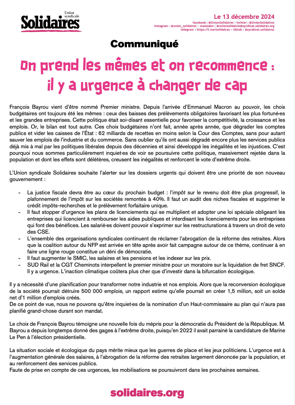François Bayrou vient d’être nommé Premier ministre. Depuis l’arrivée d’Emmanuel Macron au pouvoir, les choix budgétaires ont toujours été les mêmes : ceux des baisses des prélèvements obligatoires favorisant les plus fortuné∙es et les grandes entreprises. Cette politique était soi-disant essentielle pour favoriser la compétitivité, la croissance et les emplois. Or, le bilan est tout autre. Ces choix budgétaires n’ont fait, année après année, que dégrader les comptes publics et vider les caisses de l’État : 62 milliards de recettes en moins selon la Cour des Comptes, sans pour autant sauver les emplois de l’industrie et du commerce. Sans oublier qu’ils ont aussi dégradé encore plus les services publics déjà mis à mal par les politiques libérales depuis des décennies et ainsi développé les inégalités et les injustices. C’est pourquoi nous sommes particulièrement inquiet·es de voir se poursuivre cette politique, massivement rejetée dans la population et dont les effets sont délétères, creusent les inégalités et renforcent le vote d’extrême droite.