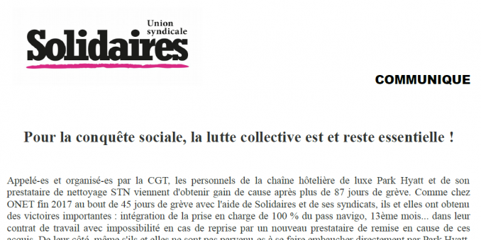 Appelé-es et organisé-es par la CGT, les personnels de la chaîne hôtelière de luxe Park Hyatt et de son prestataire de nettoyage STN viennent d'obtenir gain de cause après plus de 87 jours de grève. Comme chez ONET fin 2017 au bout de 45 jours de grève avec l'aide de Solidaires et de ses syndicats, ils et elles ont obtenu des victoires importantes : intégration de la prise en charge de 100 % du pass navigo, 13ème mois... dans leur contrat de travail avec impossibilité en cas de reprise par un nouveau prestataire de remise en cause de ces acquis. De leur côté, même s'ils et elles ne sont pas parvenu-es à se faire embaucher directement par Park Hyatt, les salarié-es de STN ont obtenu que leur grille de rémunération soit alignée sur celle beaucoup plus avantageuse de son donneur d'ordre. Ensuite ils et elles pourront être désigné-es comme représentant-es de proximité dans le cadre du nouveau CSE à élire à Park Hyatt en 2019. Un véritable pied de nez aux ordonnances Macron !