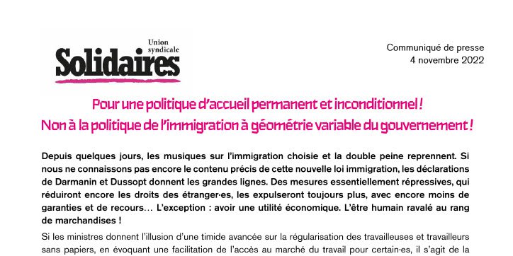 Pour l’Union syndicale Solidaires, on ne peut pas envisager les déplacements humains comme des phénomènes comptables, ou des rapports sur investissement ! On ne peut pas conditionner la liberté de circulation et d’installation au gré du besoin de main-d'œuvre à bon marché du patronat. C’est pour cela que Solidaires et SUD PTT participent activement à la lutte des travailleurs sans papiers de DPD, Chronopost et RSI pour leur régularisation et l’amélioration de leurs conditions de travail.
