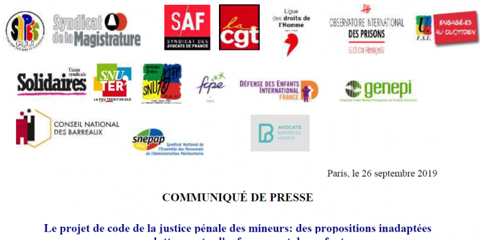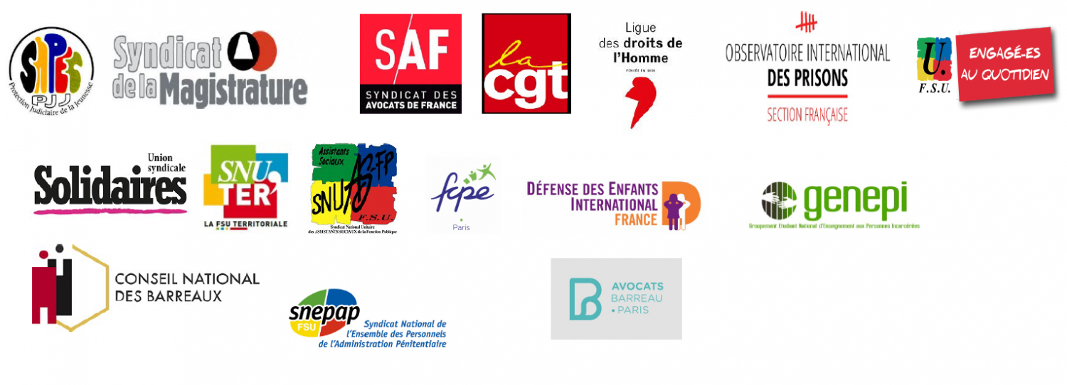 Signataires: SM, SAF, SNPES-PJJ/FSU, CGT PJJ, LDH, OIP, CGT SP, SNUTER, SNUASFP, SNEPAP, GENEPI, DEI-France, CGT, FSU, Solidaire, Solidaire Justice, FCPE75, Barreau de Paris, CNB.