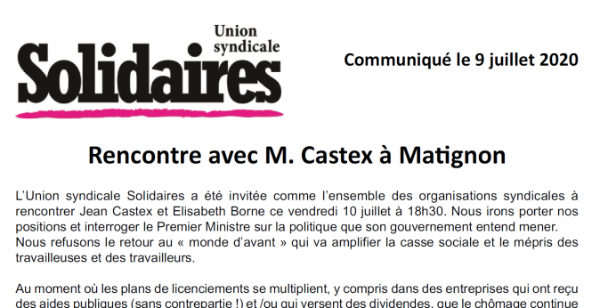 L’Union syndicale Solidaires a été invitée comme l’ensemble des organisations syndicales à rencontrer Jean Castex et Elisabeth Borne ce vendredi 10 juillet à 18h30. Nous irons porter nos positions et interroger le Premier Ministre sur la politique que son gouvernement entend mener.