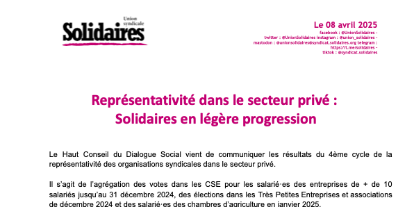 L’obtention de la représentativité dans 38 branches est un élément positif et un point d’appui fort. Solidaires devient la première organisation chez les employés des cinémas et conserve la première place chez les journalistes, les centres d’initiatives en milieu rural et les organismes de la confédération paysanne. Elle obtient la représentativité dans le secteur des librairies, des assistants parlementaires, de la navigation intérieure, de la production cinématographique, du spectacle vivant… Dans certains secteurs, Solidaires connaît une forte progression comme dans l’animation (+8,92).