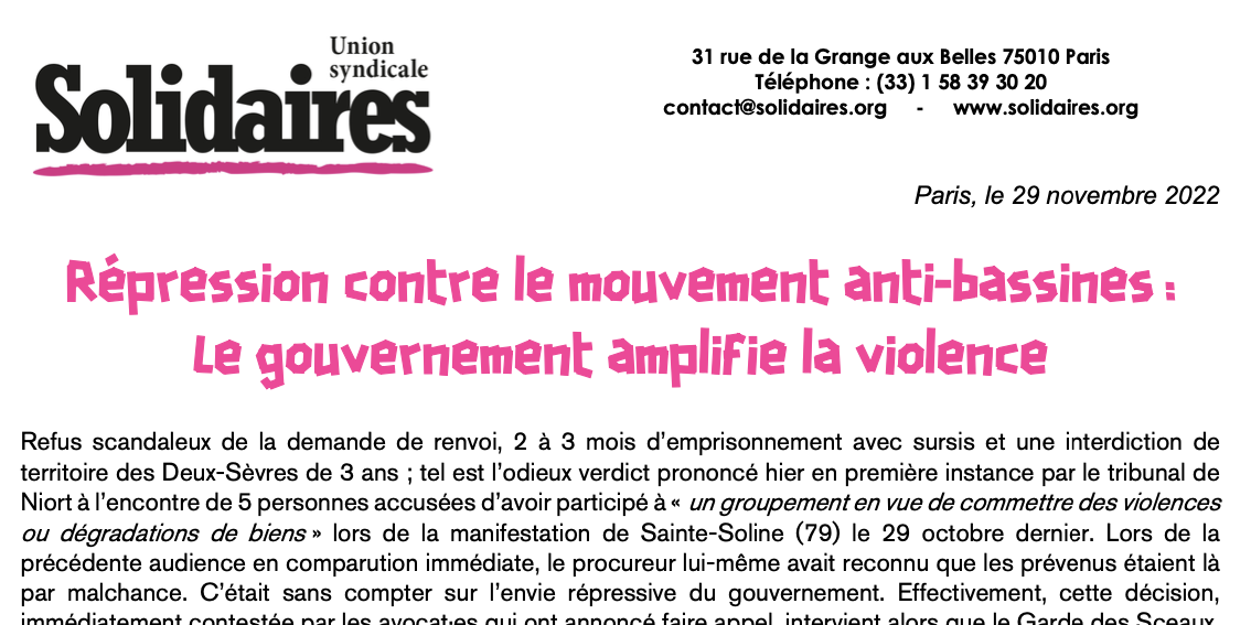 L’Union syndicale Solidaires, engagée depuis longtemps dans la lutte contre le développement des méga- bassines, apporte tout son soutien aux personnes réprimées, harcelées, condamnées, menacées, violentées uniquement à cause de leur engagement pour un autre modèle agricole respectueux du vivant.