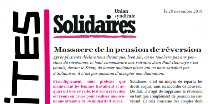 Pour Solidaires, la réversion doit être maintenue par principe, car alors que les femmes partent en retraite un an plus tard que les hommes, elles ne touchent que 60 % de la retraite d’un homme et elles sont 45 % à survivre avec un minimum de pension.