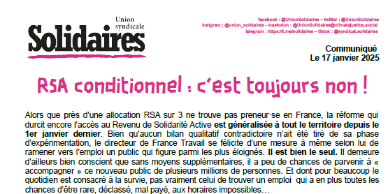 En ce début 2025, les résultats s’étalent donc sous nos yeux : ce RSA conditionné à un minimum de 15h à 20h hebdomadaires d’activités est une trappe à emploi gratuit, notamment pour des collectivités exsangues financièrement qui y voient l’occasion de sous-traiter gratuitement leurs travaux. Et au lieu d’y recourir, les allocataires se détournent de plus en plus du RSA, rebuté·es par le flicage (1,5 million de contrôles prévus en 2027 !) et les algorithmes de tri et de suivi mis en place. Et pour quel résultat en termes d’emplois ? Selon les estimations, moins d’1 allocataire du RSA sur 5 a trouvé en moyenne un emploi durable (3,6 % pour ceux considéré·es comme les plus « éloigné·es » de l’emploi), soit peu ou prou le même nombre qu’avant la réforme ! Tout ça pour ça !