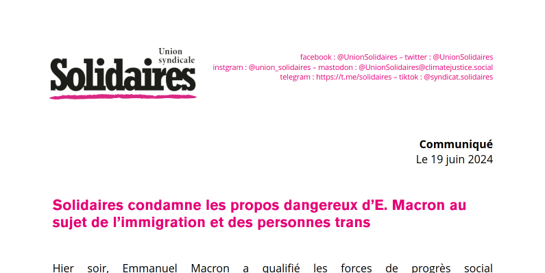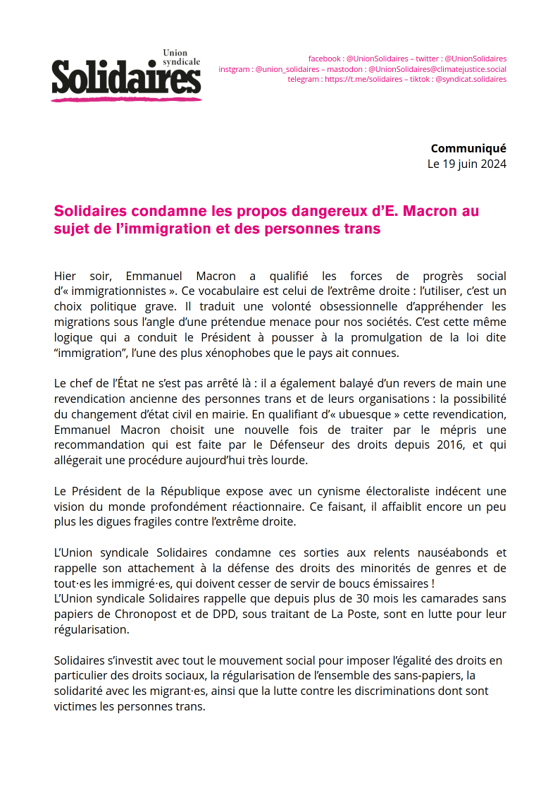 L’Union syndicale Solidaires condamne ces sorties aux relents nauséabonds et rappelle son attachement à la défense des droits des minorités de genres et de tout⋅es les immigré⋅es, qui doivent cesser de servir de boucs émissaires !