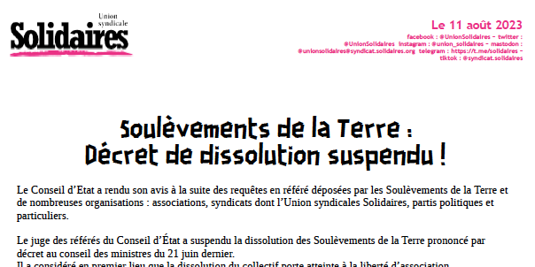 Soulèvements de la Terre : Décret de dissolution suspendu !