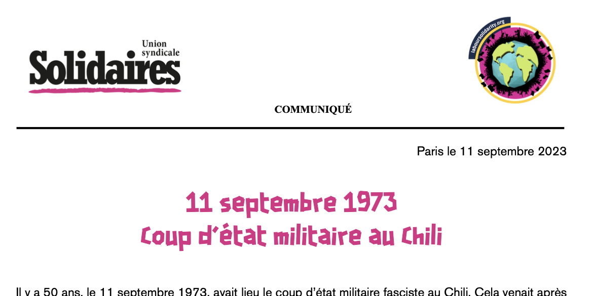Au Chili comme ailleurs, les coups d’état impérialistes, fascistes, militaires ont pour but de terroriser les populations afin d’écarter toute idée d’alternatives au système en place et de laisser place nette aux capitalistes. La solidarité face à la répression est indispensable et salutaire. Mais pour éviter ces situations, il faut agir avant et chaque jour, renforcer les outils de résistance et alternative de notre classe sociale, le syndicalisme, dont le Réseau syndical international de solidarité et de luttes.