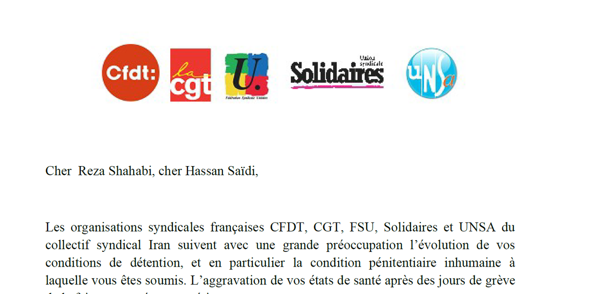 Les organisations syndicales françaises CFDT, CGT, FSU, Solidaires et UNSA du collectif syndical Iran suivent avec une grande préoccupation l’évolution de vos conditions de détention, et en particulier la condition pénitentiaire inhumaine à laquelle vous êtes soumis. L’aggravation de vos états de santé après des jours de grève de la faim nous préoccupe sérieusement. L’intégrité physique de chacun de vous est une condition préalable à la continuation de vos luttes pour les justes revendications des travailleurs et travailleuses en Iran. La grève de la faim que vous avez entamée, a déjà alarmé l’opinion publique sur vos situations. Nous pensons que le sérieux et la sincérité de vos gestes donnent une grande force à votre message adressé à la communauté internationale. Reza et Hassan, les travailleurs et travailleuses ont besoin de vous ! Pour ces raisons, nos organisations syndicales soutiennent la position du syndicat Vahed estimant qu'il est maintenant urgent de suspendre vos grèves de la faim. C'est pour nous le meilleur moyen pour que vous puissiez continuer à participer à la lutte pour les droits syndicaux fondamentaux. Quelque soit vos décisions, nous continuerons bien entendu à exiger votre libération ainsi que l'accès aux soins médicaux dont vous avez besoin.