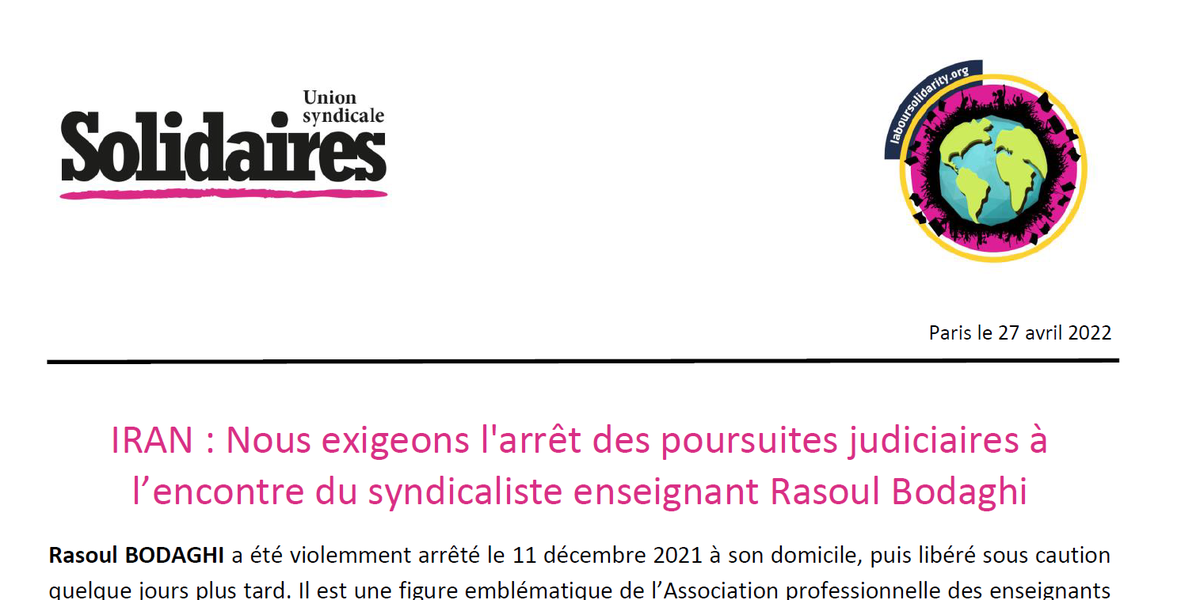 - exige l'arrêt des poursuites judiciaires à l’encontre de Rasoul BODAGHI et la libération immédiate et inconditionnelle de tou-tes les militant-es emprisonné-es en raison de leurs activités syndicales ;