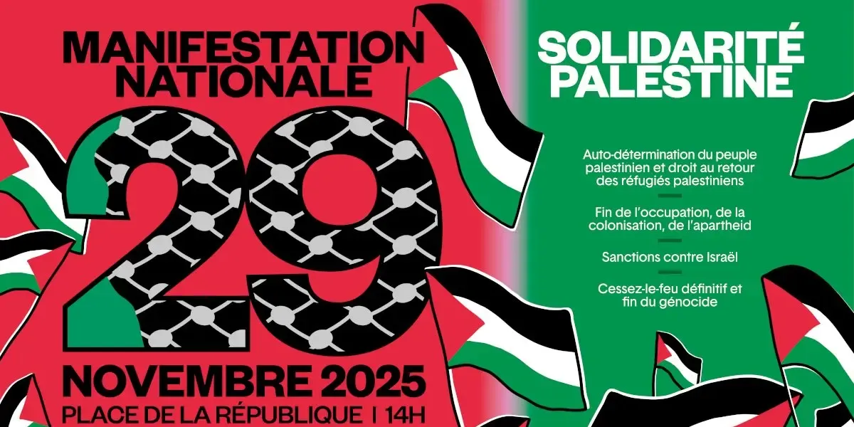 À Paris, lors de la manifestation nationale du 29 novembre, journée internationale de solidarité avec le peuple palestinien, nous montrerons la force de notre mobilisation pour les droits du peuple palestinien, et pour un monde fondé sur le droit et sur le respect de notre humanité commune.