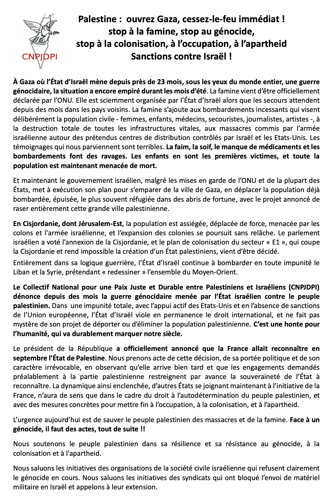 Le Collectif National pour une Paix Juste et Durable entre Palestiniens et Israéliens (CNPJDPI) dénonce depuis des mois la guerre génocidaire menée par l’État israélien contre le peuple palestinien. Dans une impunité totale, avec l’appui actif des Etats-Unis et en l’absence de sanctions de l’Union européenne, l’État d’Israël viole en permanence le droit international, et ne fait pas mystère de son projet de déporter ou d’éliminer la population palestinienne. C’est une honte pour l’humanité, qui va durablement marquer notre siècle.