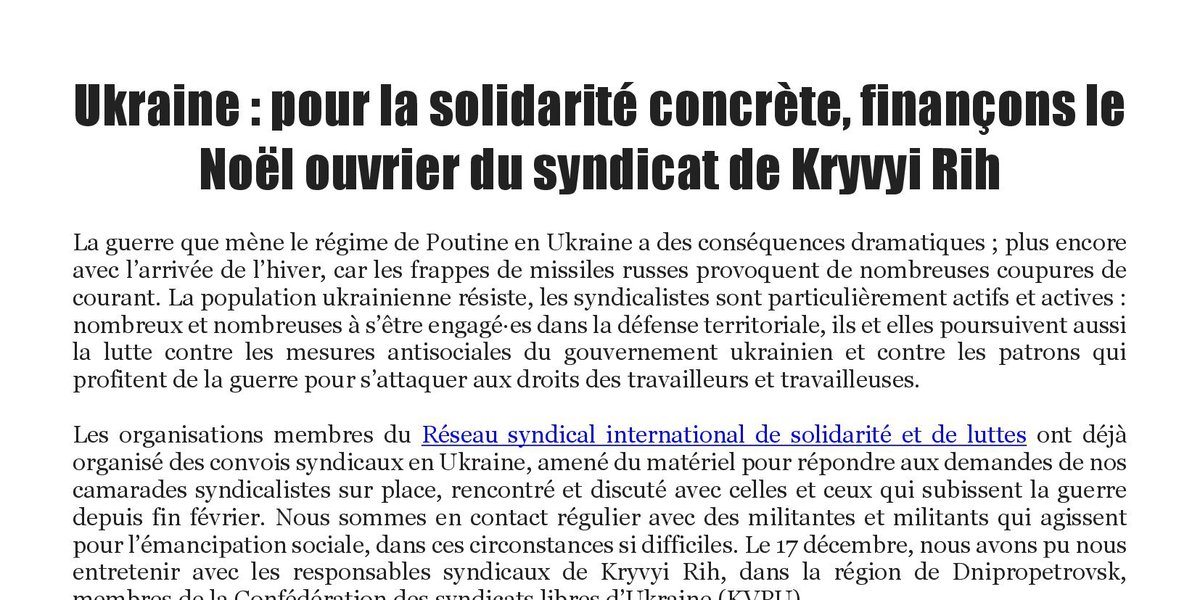 Le Réseau syndical international de solidarité et de luttes vous appelle à participer à la campagne de dons que nous venons de lancer. Avec ces dons et l’appui des syndicats membres du Réseau syndical international de solidarité et de luttes, nous financerons un nouveau convoi syndical vers l’Ukraine. Mais nous proposons de réserver une partie de la somme, dès maintenant, pour le Noël ouvrier de Kryvyi Rih. Bien sûr, nous informerons de l’utilisation de ces dons.