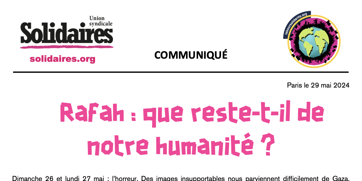 L’Union syndicale Solidaires participe à ce mouvement social de soutien au peuple palestinien dans des cadres larges et unitaires, pour faire entendre une autre voix. La voix de celles et ceux qui refusent la barbarie.