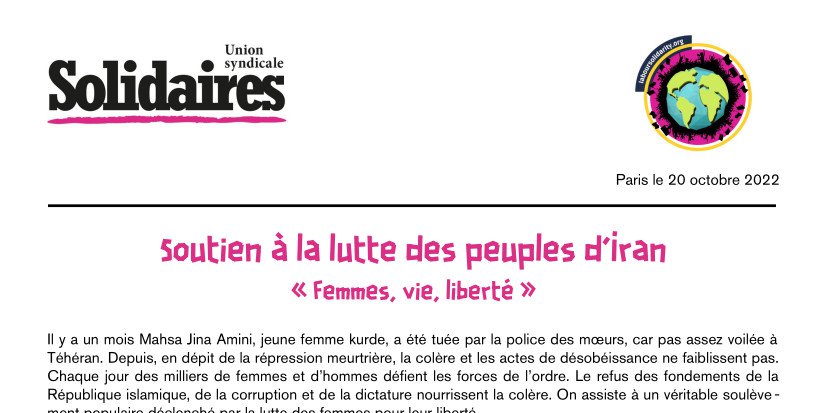 Il y a un mois Mahsa Jina Amini, jeune femme kurde, a été tuée par la police des mœurs, car pas assez voilée à Téhéran. Depuis, en dépit de la répression meurtrière, la colère et les actes de désobéissance ne faiblissent pas. Chaque jour des milliers de femmes et d’hommes défient les forces de l’ordre. Le refus des fondements de la République islamique, de la corruption et de la dictature nourrissent la colère. On assiste à un véritable soulèvement populaire déclenché par la lutte des femmes pour leur liberté.