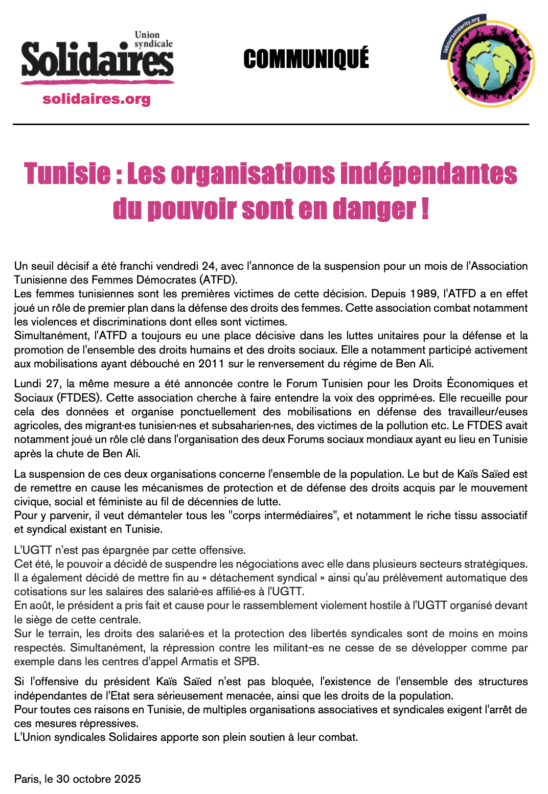Pour toutes ces raisons en Tunisie, de multiples organisations associatives et syndicales exigent l'arrêt de ces mesures répressives.
