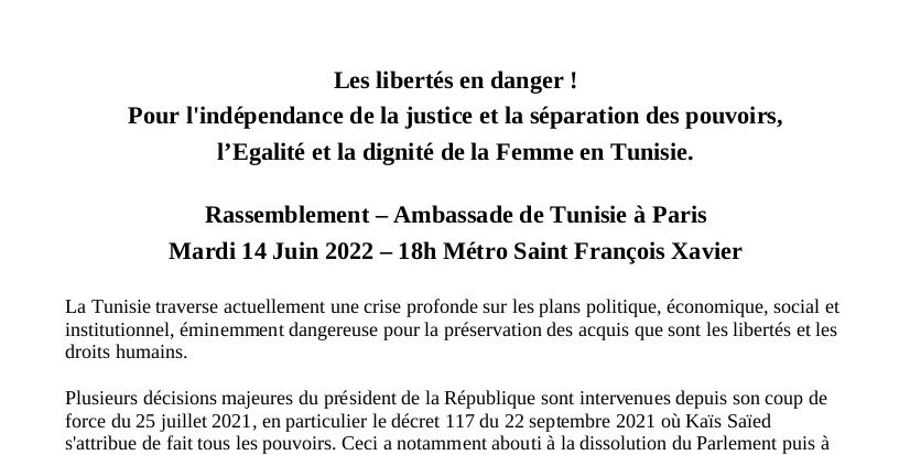 un rassemblement le mardi 14 juin à 18h devant l'ambassade de Tunisie à Paris, métro Saint-François Xavier.