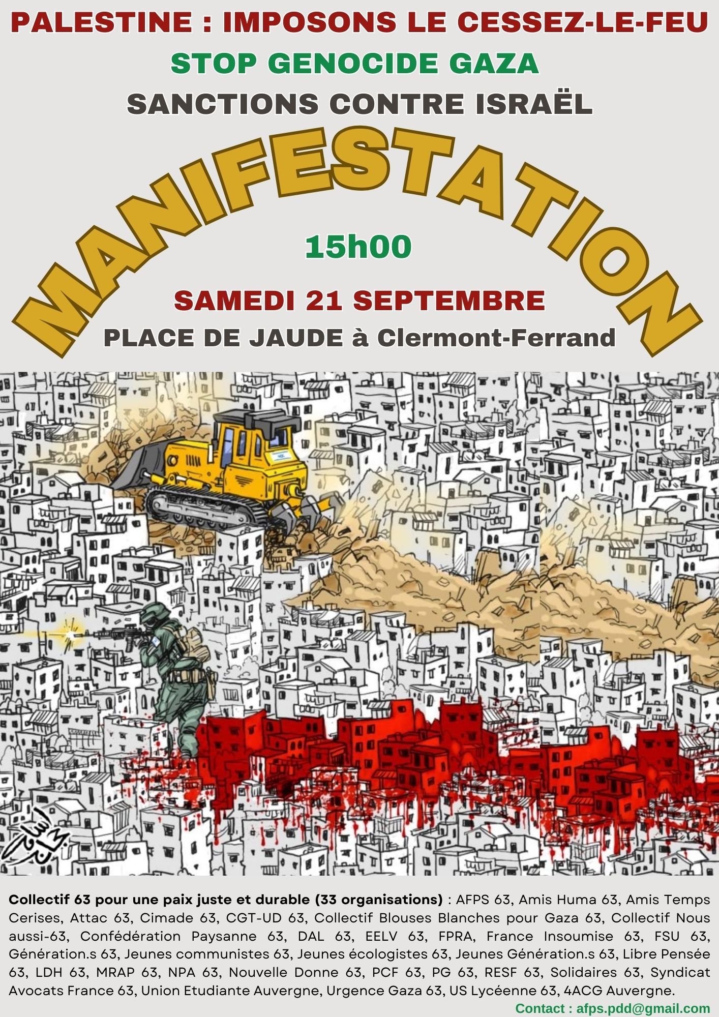 Rassemblement unitaire à l'appel du collectif pour une paix juste et durable 63 : Samedi 21 Septembre 2024 15h place de Jaude.