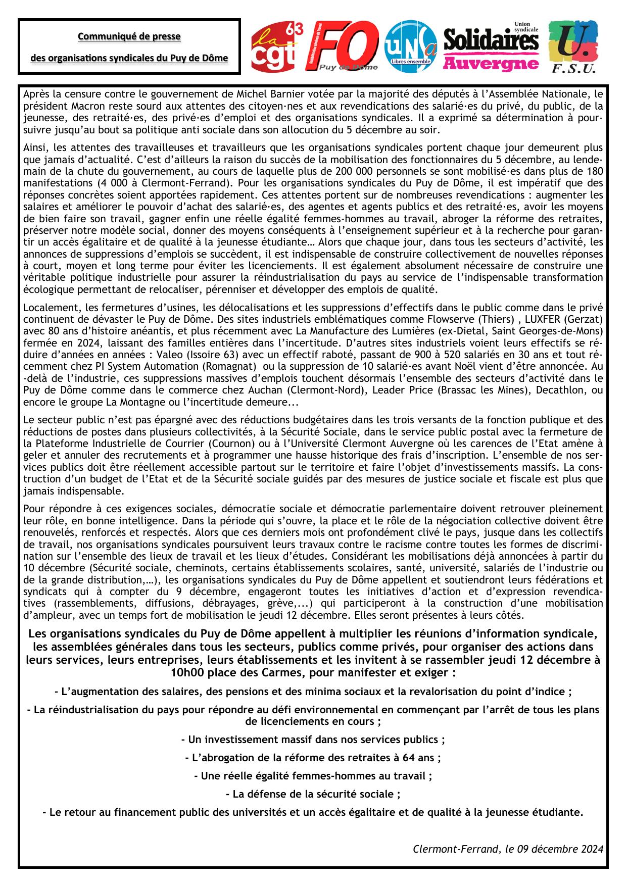 Les organisations syndicales du Puy de Dôme appellent à multiplier les réunions d’information syndicale, les assemblées générales dans tous les secteurs, publics comme privés, pour organiser des actions dans leurs services, leurs entreprises, leurs établissements et les invitent à se rassembler jeudi 12 décembre à 10h00 place des Carmes, pour manifester et exiger :