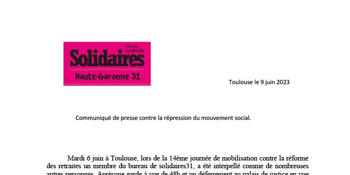 Mardi 6 juin à Toulouse, lors de la 14ème journée de mobilisation contre la réforme des retraites un membre du bureau de solidaires31, a été interpellé comme de nombreuses autres personnes. Après une garde à vue de 48h et un déferrement au palais de justice en vue d’une comparution devant le procureur, notre camarade s’est vu signifier une interdiction de manifester dans l’attente de son procès en décembre.