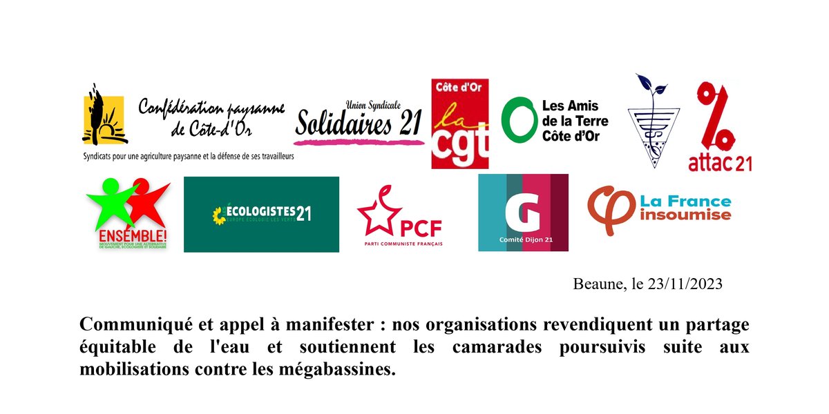 La Confédération Paysanne 21, la Levée des Semis (comité local des Soulèvements de la Terre), la CGT 21, Solidaires 21, les écologistes 21, La France Insoumise 21, le Parti Communiste Français 21, Génération.s 21, Ensemble 21, Attac 21 et les Amis de la Terre 21 appellent à manifester à Beaune mardi soir 28 novembre prochain pour signifier leur soutien aux neuf prévenus du procès des défenseurs de l'eau au tribunal correctionnel de Niort qui se tiendra ce même jour. RDV Porte Saint Nicolas à 18h00 pour le début de la marche.