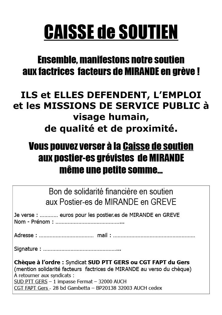 35ème jour de grève à Mirande Les facteurs-factrices et agents du centre courrier de MIRANDE, en grève depuis le mardi 30 janvier, pour l’emploi, les conditions de travail et un service public à visage humain POURSUIVENT LA GRÈVE.