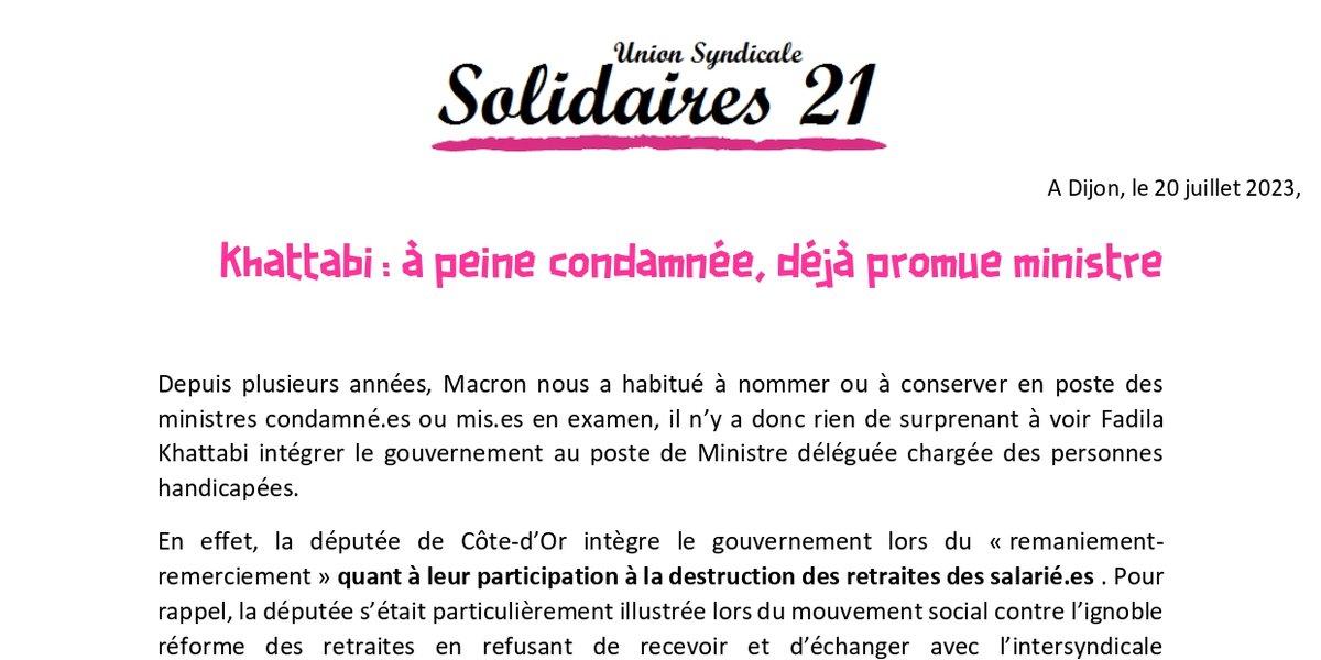Depuis plusieurs années, Macron nous a habitué à nommer ou à conserver en poste des ministres condamné.es ou mis.es en examen, il n’y a donc rien de surprenant à voir Fadila Khattabi intégrer le gouvernement au poste de Ministre déléguée chargée des personnes handicapées.