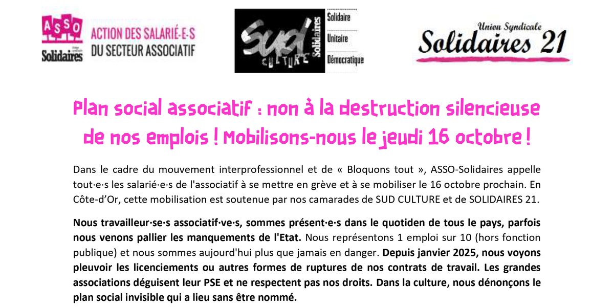 Dans le cadre du mouvement interprofessionnel et de « Bloquons tout », ASSO-Solidaires appelle tout·e·s les salarié·e·s de l'associatif à se mettre en grève et à se mobiliser le 16 octobre prochain. En Côte-d’Or, cette mobilisation est soutenue par nos camarades de SUD CULTURE et de SOLIDAIRES 21. Nous travailleur·se·s associatif·ve·s, sommes présent·e·s dans le quotiden de tous le pays, parfois nous venons pallier les manquements de l'Etat. Nous représentons 1 emploi sur 10 (hors fonction publique) et nous sommes aujourd'hui plus que jamais en danger. Depuis janvier 2025, nous voyons pleuvoir les licenciements ou autres formes de ruptures de nos contrats de travail. Les grandes associations déguisent leur PSE et ne respectent pas nos droits. Dans la culture, nous dénonçons le plan social invisible qui a lieu sans être nommé. L’austérité détruit nos emplois, détériore nos conditions de travail ainsi que la vie quotidienne des millions d’usager·es des associations, qui verront des services et des projets, dont iels bénéficient, supprimés ou dégradés. Les problèmes de notre secteur ne sont pas nouveaux mais ils s'accentuent : bas salaires, instabilité et turnover, contrats précaires, heures supplémentaires non rémunérées, débordements de la fiche de poste lorsqu’elle existe, etc. Quelques chiffres pour illustrer : - En 2024, les travailleur·euses des associations ont été concerné.e.s par 1170 procédures collectives, dont 489 liquidations. - En 2025, les budgets des collectivités territoriales, qui bénéficient en partie aux associations, ont été amputés de 2,2 milliards d’euros. - Pour 2026, le plan Bayrou prévoyait d’augmenter la saignée en retirant plusieurs milliards aux budgets des associations. Un plan que le nouveau premier ministre soutenait. Les bénévoles dirigeants associatifs ont indiqué qu'un tiers des structures prévoyaient des licenciements, ce qui impliquerait des dizaines de milliers de licenciements. Nous appelons à la mobilisation des travailleur·se·s associatif·ve·s contre une politique économique mortifère qui n'est pas à la hauteur des crises qui éclatent dans le pays, alors même que l'extrême droite n'a jamais été aussi proche du pouvoir. Pour lutter contre les crises - crise écologique, crise sociale, explosion du racisme et des LGBTQphobies, destruction des services publics et de l'éducation nationale-, une seule solution : se mobiliser dans la rue et s’organiser pour imposer une autre politique économique. Les politiques d’austérité ne sont pas une fatalité et d'autres chemins sont possibles ! Les 10 et 18 septembre ont été des grandes réussites avec des taux de grève et un nombre de mobilisation très importants dans le secteur associatif et culturelle. Nos organisations syndicales appellent à se mobiliser pour défendre le secteur associatif et ses salarié-es le jeudi 16 octobre, devant la préfecture de Côte-d’Or à Dijon, de 12h30 à 13h30 !