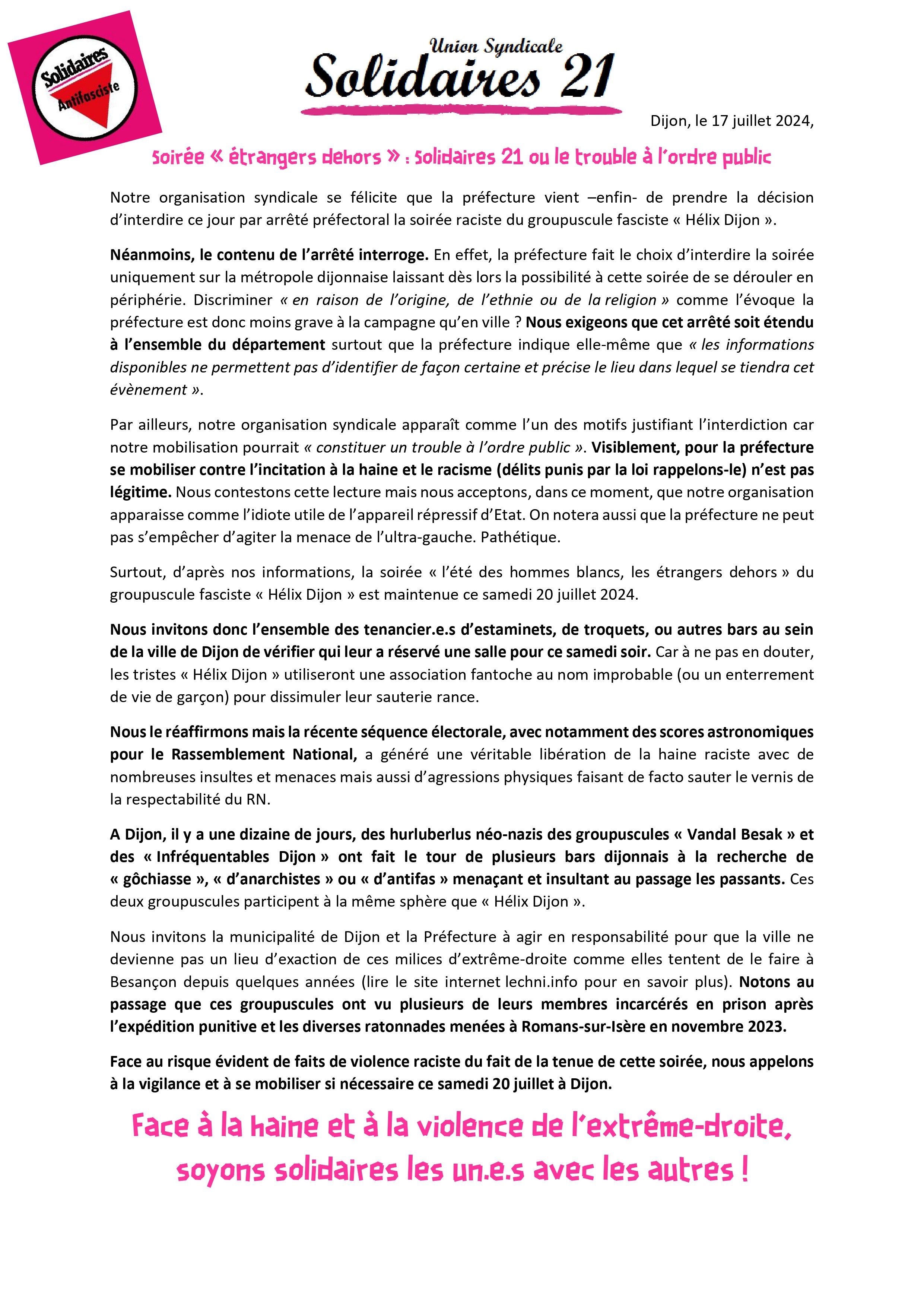 Notre organisation syndicale se félicite que la préfecture vient –enfin- de prendre la décision d’interdire ce jour par arrêté préfectoral la soirée raciste du groupuscule fasciste « Hélix Dijon ».