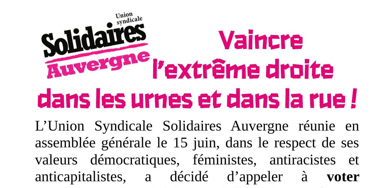 L’Union Syndicale Solidaires Auvergne réunie en assemblée générale le 15 juin, dans le respect de ses valeurs démocratiques, féministes, antiracistes et anticapitalistes, a décidé d’appeler à voter massivement les 30 juin et 7 juillet 2024 en faveur des candidat-e-s réuni-e-s sous la bannière du Nouveau Front Populaire.