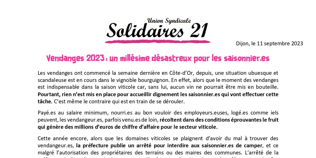 Les vendanges ont commencé la semaine dernière en Côte-d’Or, depuis, une situation ubuesque et scandaleuse est en cours dans le vignoble bourguignon. En effet, alors que le moment des vendanges est indispensable dans la saison viticole car, sans lui, aucun vin ne pourrait être mis en bouteille. Pourtant, rien n’est mis en place pour accueillir dignement les saisonnier.es qui vont effectuer cette tâche. C’est même le contraire qui est en train de se dérouler.