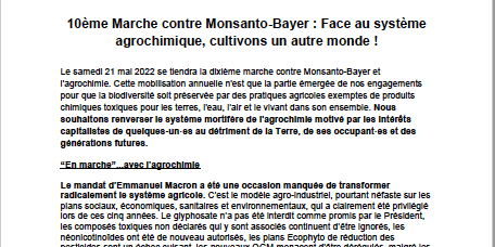 Le samedi 21 mai 2022 se tiendra la dixième marche contre Monsanto-Bayer et l'agrochimie. Cette mobilisation annuelle n'est que la partie émergée de nos engagements pour que la biodiversité soit préservée par des pratiques agricoles exemptes de produits chimiques toxiques pour les terres, l'eau, l’air et le vivant dans son ensemble.