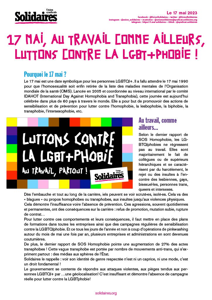 Lesbiennes, Gays, bi·es, trans, intersexes, ... : les mois de mai et juin sont ceux des fiertés! L’enjeu est bien sûr de visibiliser les LGBTQI+, mais surtout de porter haut et fièr·es nos revendications, au boulot et dans l’ensemble de la société !
