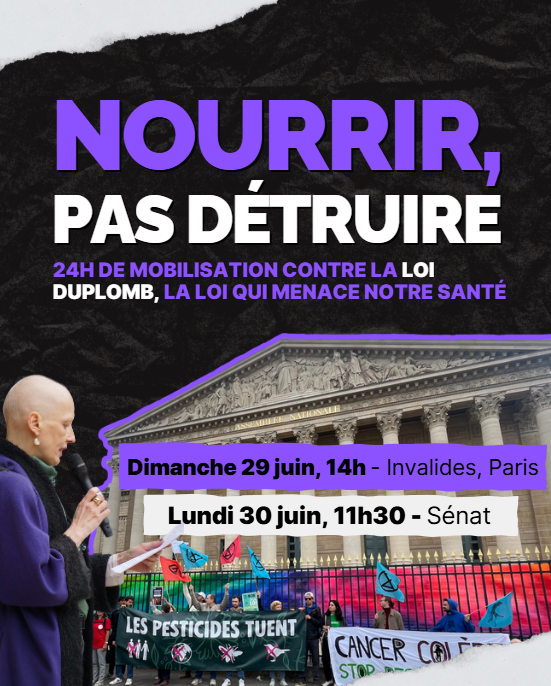 À Paris, nous appelons à se mobiliser 24h contre la loi Duplomb, du 29 au 30 juin, jour de la tenue de la CMP et qui sera suivie du vote solennel des parlementaires. Un moment clé pour dire NON à une loi qui ne vise pas à nourrir mais à détruire On compte sur votre mobilisation pour les paysans, pour notre santé, pour notre environnement et pour le respect de la science.