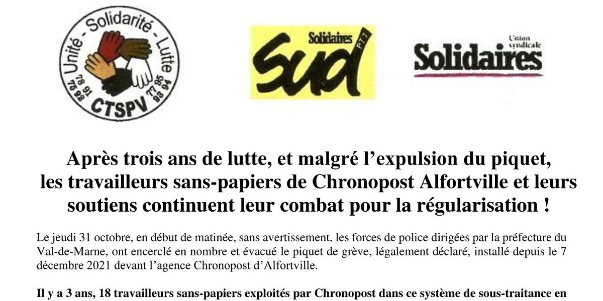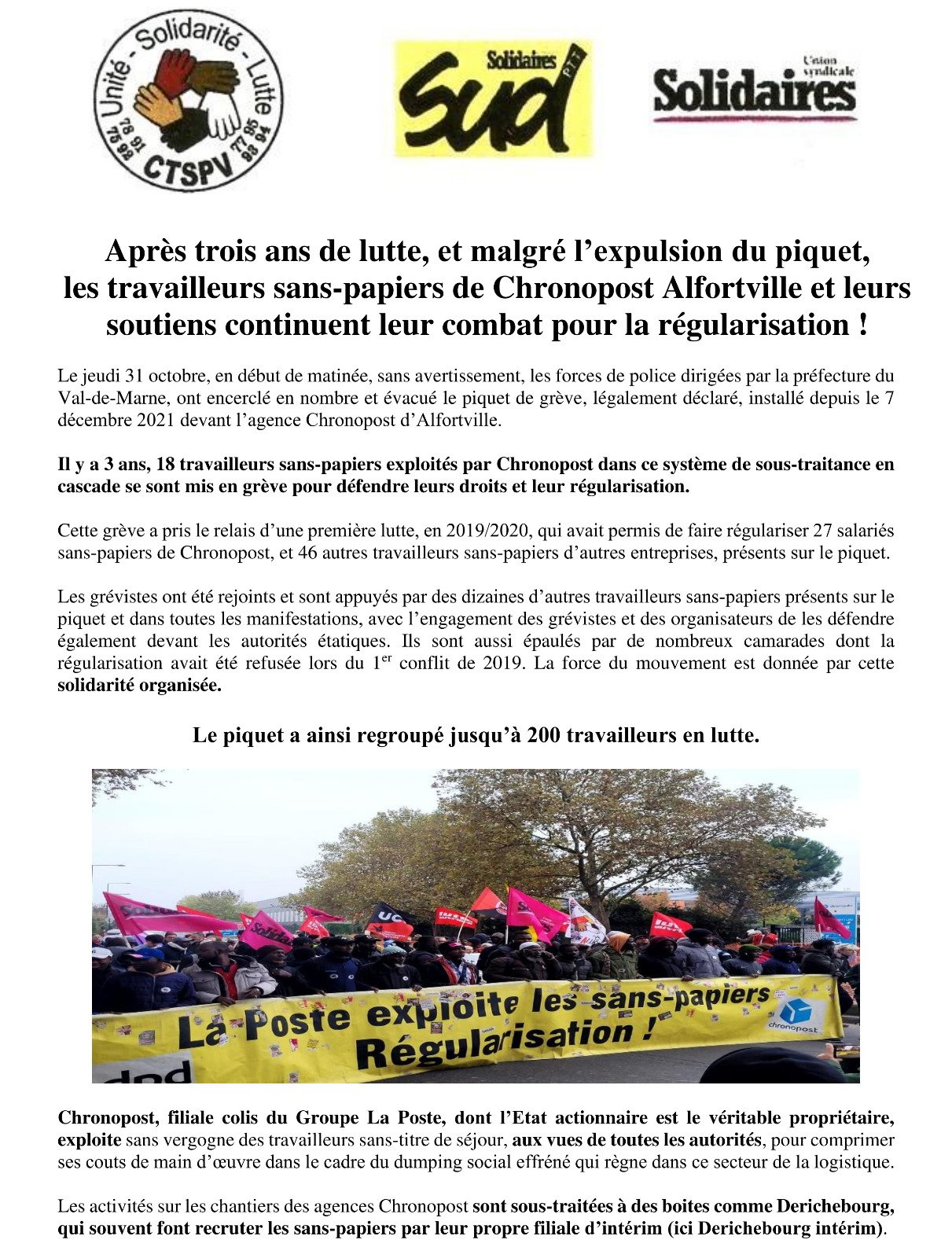 Après 3 ans de luttes et malgré l'expulsion du piquet, les travailleurs sans papiers de Chronopost et leur soutien continuent de se mobiliser pour leur régularisation