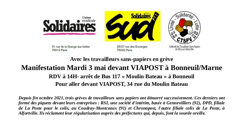 Depuis fin octobre 2021, trois grèves de travailleurs sans papiers ont démarré successivement. Ces derniers ont formé des piquets devant leurs entreprises : RSI, une société d'intérim, basée à Gennevilliers (92), DPD, filiale de La Poste pour le colis, au Coudray-Montceaux (91) et Chronopost, l'autre filiale colis de La Poste, à Alfortville. Ils réclament leur régularisation auprès des préfectures qui, depuis, font la sourde oreille.