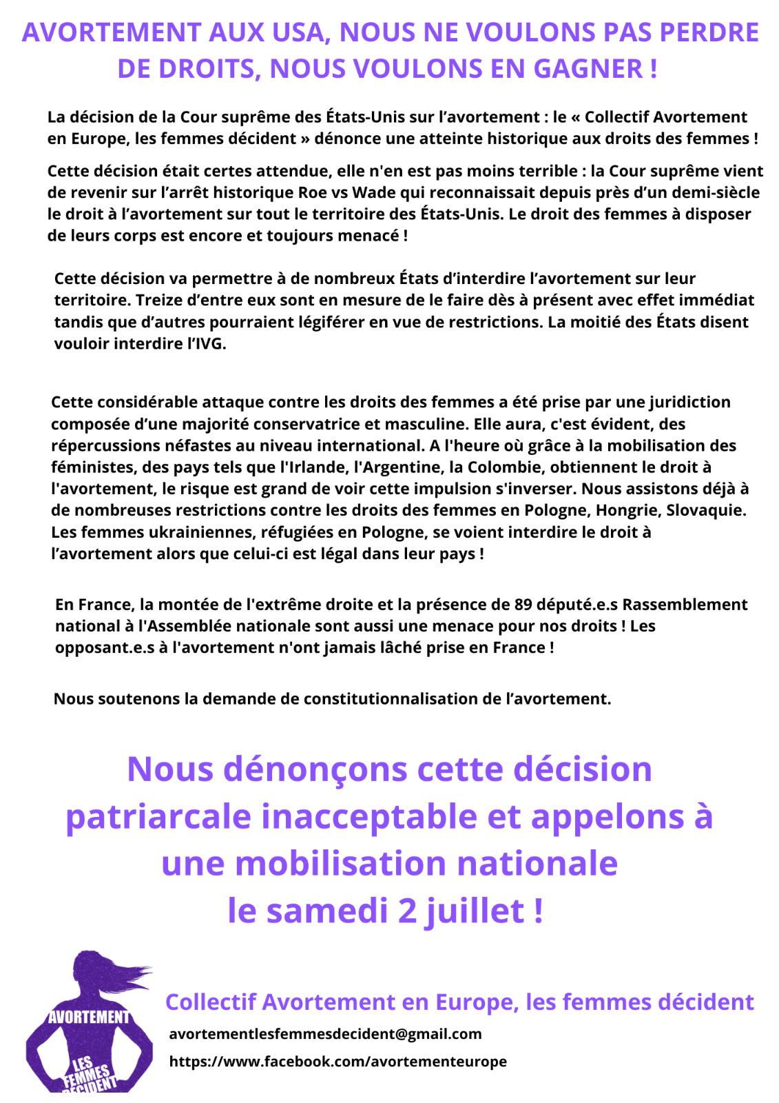 Nous dénonçons cette décision patriarcale inacceptable et appelons à une mobilisation nationale le samedi 2 juillet !