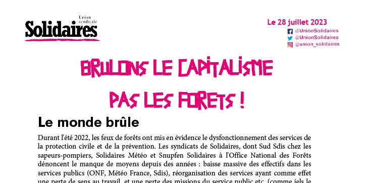 Les syndicats de Solidaires, dont Sud Sdis chez les sapeurs-pompiers, Solidaires Météo et Snupfen Solidaires à l'Office National des Forêts dénoncent le manque de moyens depuis des années : baisse massive des effectifs dans les services publics (ONF, Météo France, Sdis), réorganisation des services ayant comme effet une perte de sens au travail, et une perte des missions du service public etc. (comme iels le disent dans cette vidéo : https://vimeo.com/774180895 )