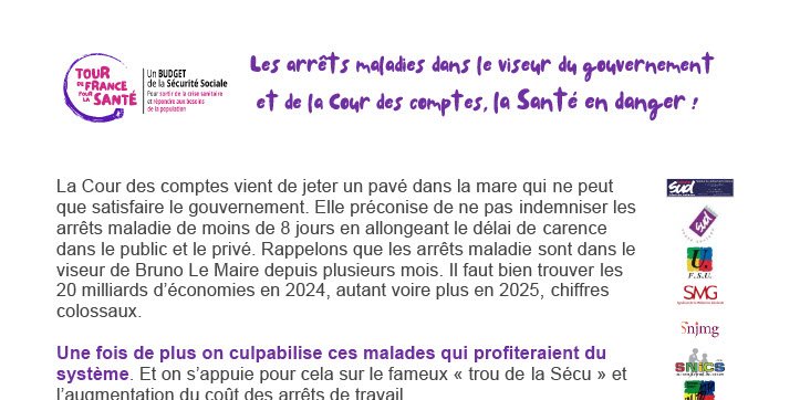Les organisations parties prenantes du Tour de France pour la santé et les organisations signataires appellent à une mobilisation citoyenne contre ces mesures, et pour la Sécurité sociale et sa réappropriation par les usager.ère.s et assuré.e.s sociaux.