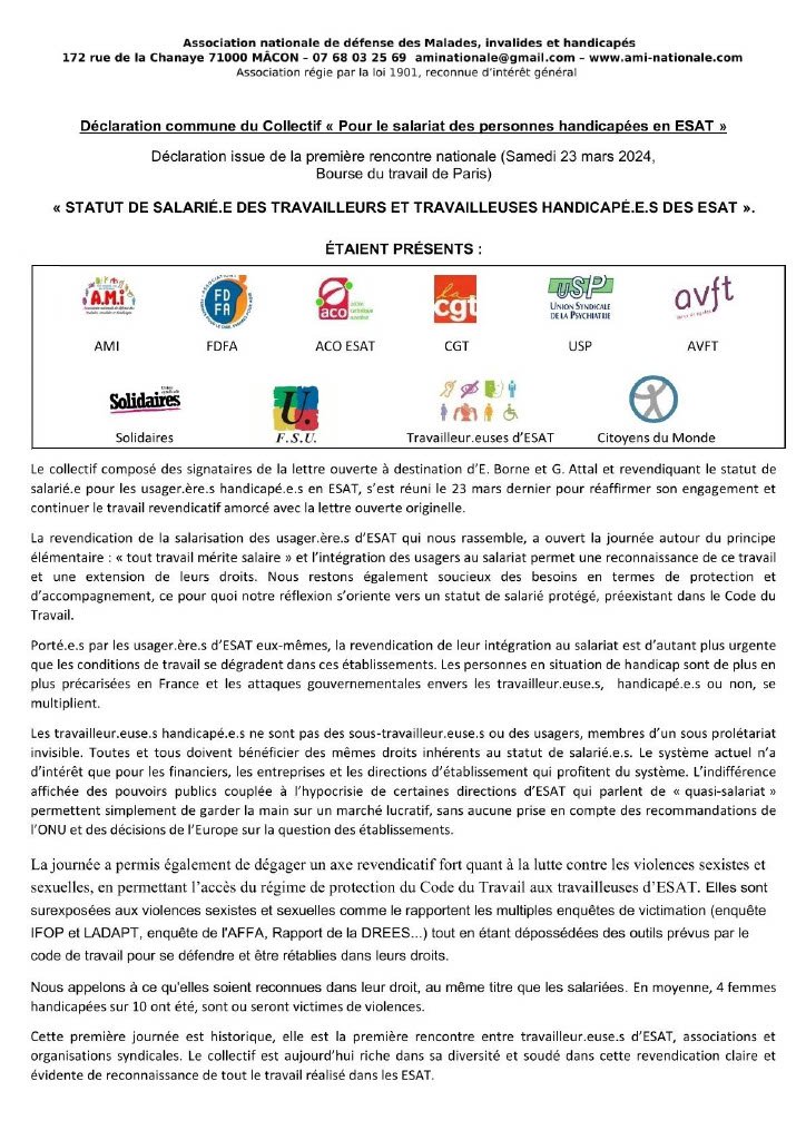 Le collectif composé des signataires de la lettre ouverte à destination d'E. Borne et G. Attal et revendiquant le statut de salarié.e pour les usager.ère.s handicapé.e.s en ESAT, s'est réuni le 23 mars dernier pour réaffirmer son engagement et continuer le travail revendicatif amorcé avec la lettre ouverte originelle.