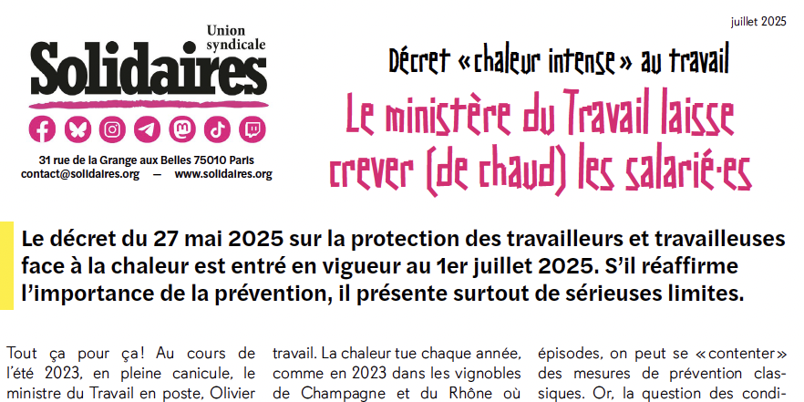 Tout ça pour ça ! Au cours de l’été 2023, en pleine canicule, le ministre du travail en poste, Olivier Dussopt, annonçait de nouvelles mesures pour protéger les travailleur·euses contre les risques d’exposition aux fortes chaleurs. Près de deux ans après, un décret et un arrêté ont été publiés le 27 mai 2025[1] pour « renforcer » la protection contre les fortes chaleurs et effets de la canicule au travail. Problème : alors que les épisodes de fortes chaleurs se multiplient et que les effets des chaleurs intenses sur la santé humaine, notamment pendant le travail, ne sont plus à démontrer, le ministère du travail fait du quasi-surplace en matière de réglementation, sans doute pour ne pas fâcher le patronat.
