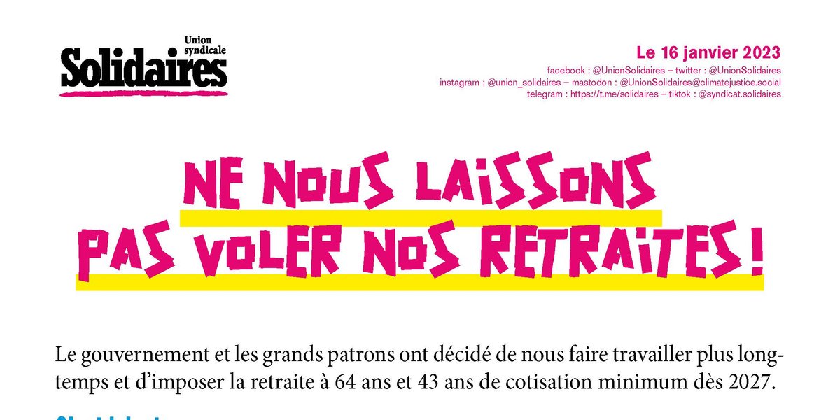 Nous voulons profiter de notre retraite ! C’est mérité après des dizaines d’années de travail. Notre pays n’a jamais créé autant de richesses. Nous n'acceptons pas de payer pour les riches en travaillant plus longtemps.
