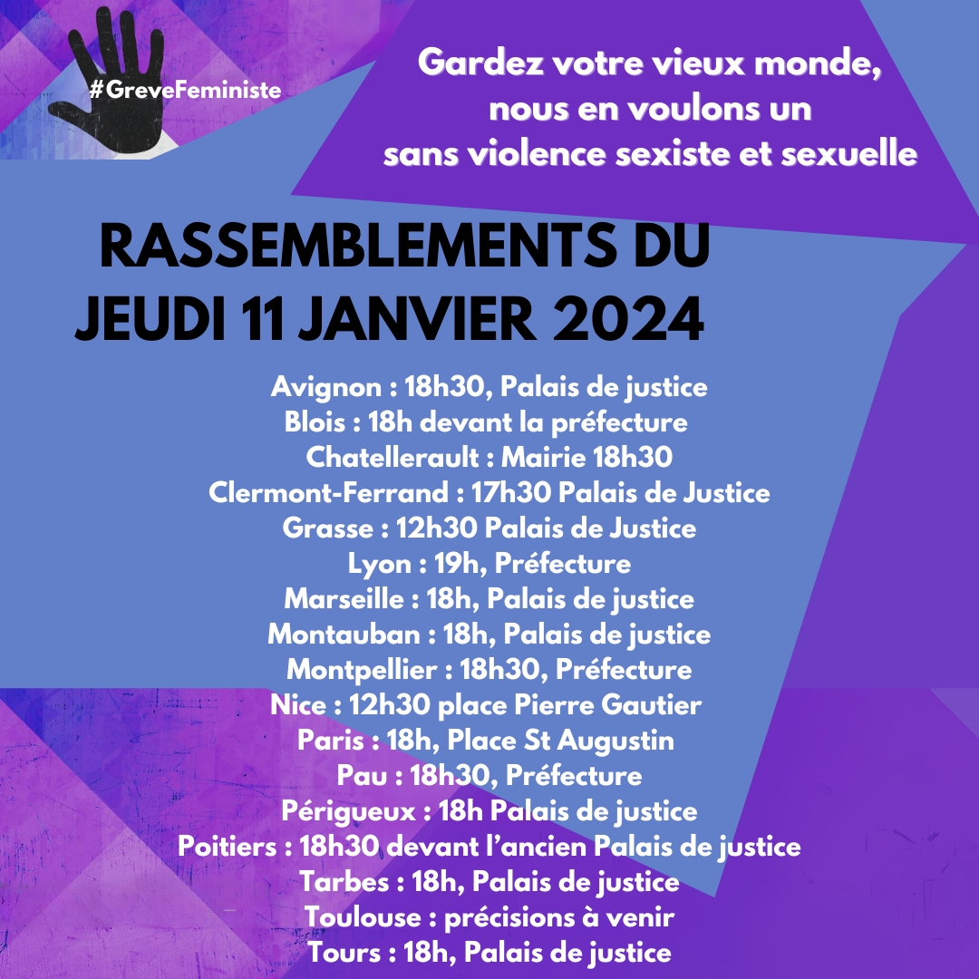 Nous appelons toutes celles et ceux qui défendent les droits des femmes, des enfants et des minorités de genres, et qui refusent les violences sexistes et sexuelles à des rassemblements devant toutes les préfectures ou les palais de Justice de France le Jeudi 11 janvier 2024.